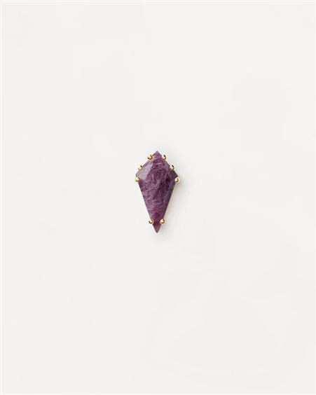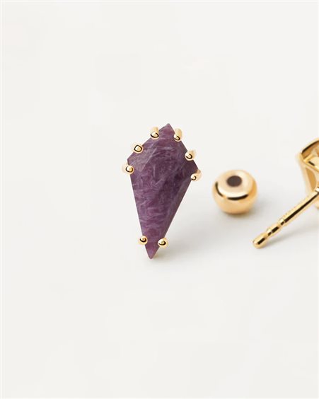 MATERIALE: Argento sterling 925 FINITURA: Placcatura in oro 18k PIETRE: Charoite naturale DIMENSIONI DELLA PIETRA: 12x6 mm SISTEMA DI CHIUSURA: Speciale chiusura di sicurezza (rivestita in silicone) e perno più corto progettato per una miglior presa e maggior comfort per tutti i giorni PESO: 0,57 g