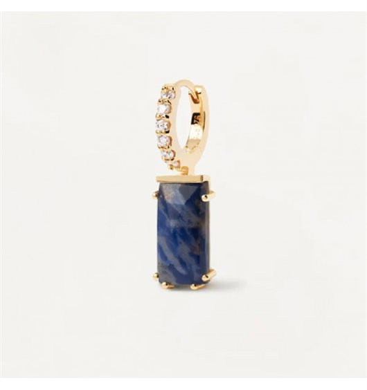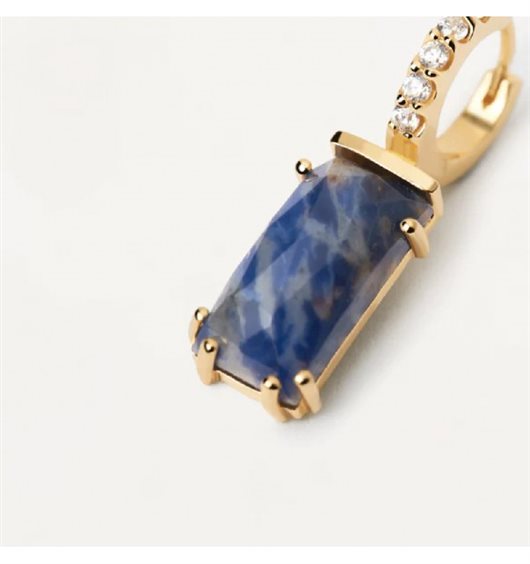 Mono orecchino a cerchio realizzato in argento 925% con finitura in oro 18kt e impreziosito da zirconi bianchi. Sodalite pendente dalle dimensioni di 12 mm x 6 mm. Peso di circa 1,30 g.