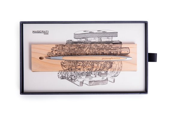 La collaborazione tra Pininfarina Segno e Maserati celebra la bellezza, l'artigianalità e l'innovazione che da sempre contraddistinguono i due marchi. Queste le qualità espresse da Pininfarina Cambiano Engine Maserati edition che con la forma iconica del suo stelo ed il puntale in lega metallica Ethergraf incontra le geometrie di un poderoso propulsore Maserati creando uno strumento di scrittura rivoluzionario, leggero ed ergonomico racchiuso in un elegante e lussuoso cofanetto di legno di cedro