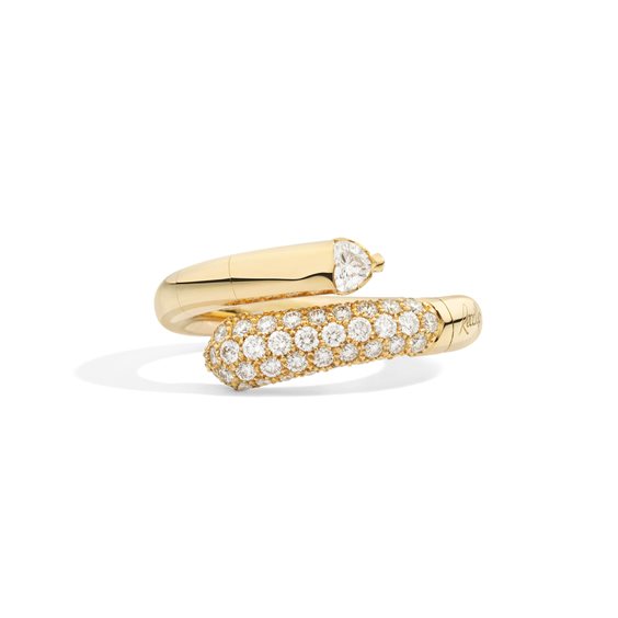 Anello contrarié flessibile, oro giallo 18 kt, 1 diamante naturale taglio brillante forma a cuore e pavé diamanti naturali forma rotonda