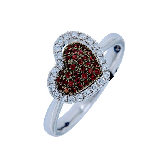Anello Recarlo a forma di cuore in oro 18kt bianco con Pavé di rubini rossi 0.22ct e contorno di diamanti 0.21ct colore F purezza Vs peso 5.10gr