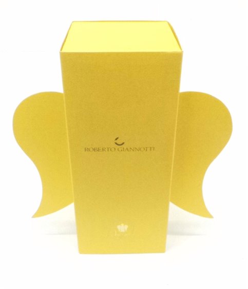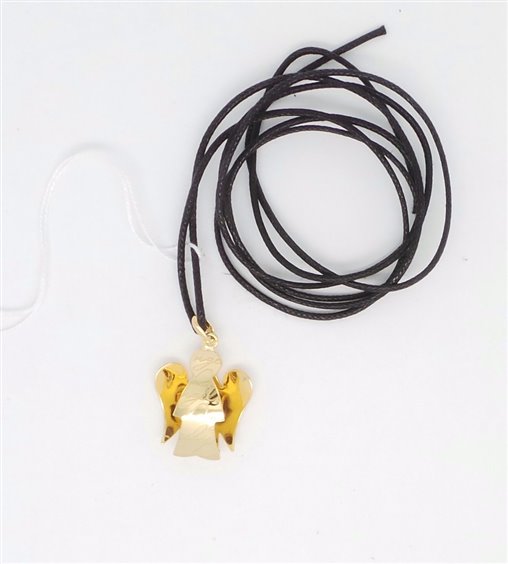 PENDENTE A FORMA DI ANGELO IN ORO GIALLO CON LOGO INCISO A LASER NELLA PARTE DAVANTI MISURA BASE 1.5 CM X 2.5 ,DOTATO DI CORDONCINO CERATO NERO .