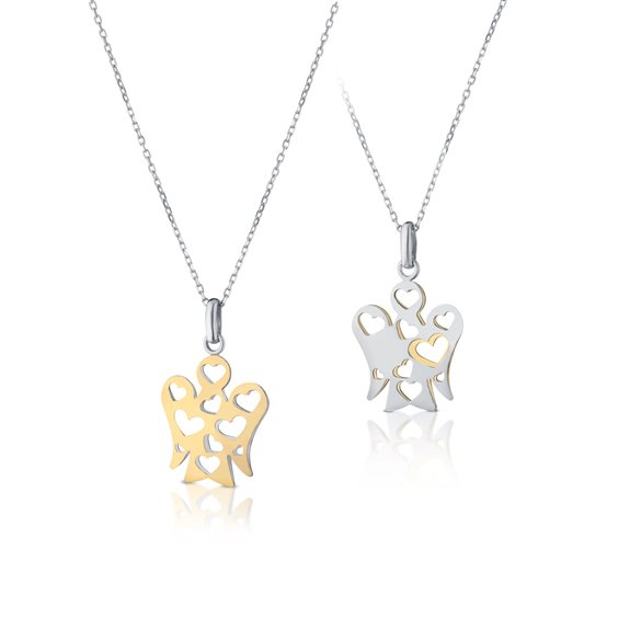 COLLANA CON PENDENTE ANGELO CON CUORI DOUBLE FACE IN ORO BIANCO E GIALLO NKT319-G Preziosa ed elegante la collana in oro bianco con pendente angelo è un accessorio unico e inimitabile. La delicata catenina in oro bianco rende la collana molto minimal e perfetta per uno stile raffinato, protagonista dell'accessorio è il charm, estremamente particolare e realizzato in maniera accurata. Un pendente a forma di angelo con intagli a cuore. Un particolare di stile estremamente delicato ma di altissima qualità che illumina in maniera unica il viso di chi lo indossa. Idea regalo perfetta per suggellare una profonda emozione, l'angelo è uno dei simboli più ricchi di significato che ci siano, amore, protezione e tanti altri sentimenti che accompagnano che riceve questo dono prezioso.