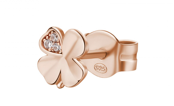 Orecchino singolo lobo in argento 925‰ e placcatura oro rosa a forma di quadrifoglio e 3 cubic zirconia bianchi.
