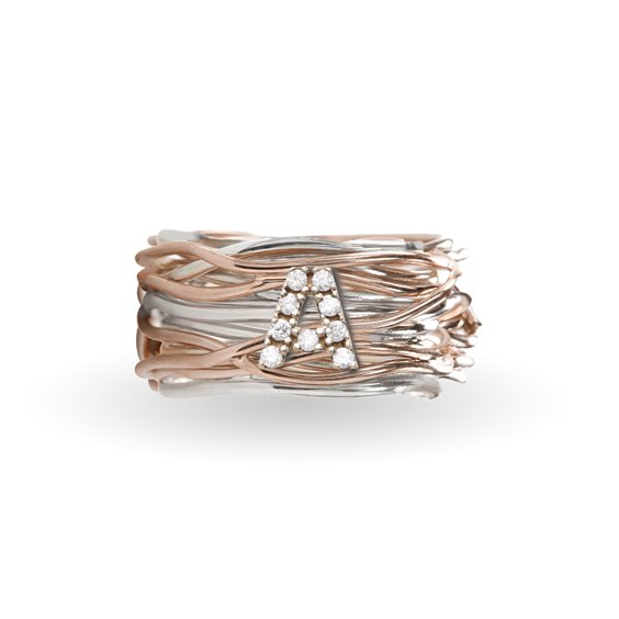 Anello Filodellavita Classic Collection, 13 Fili in Argento e Oro Rosa 9kt con letterina in Oro Bianco 18 kt di diamanti bianchi (lettera A)