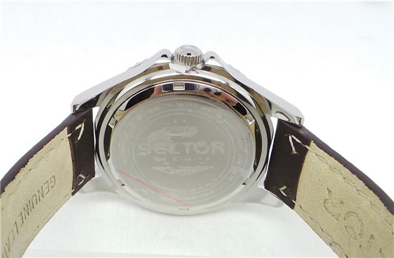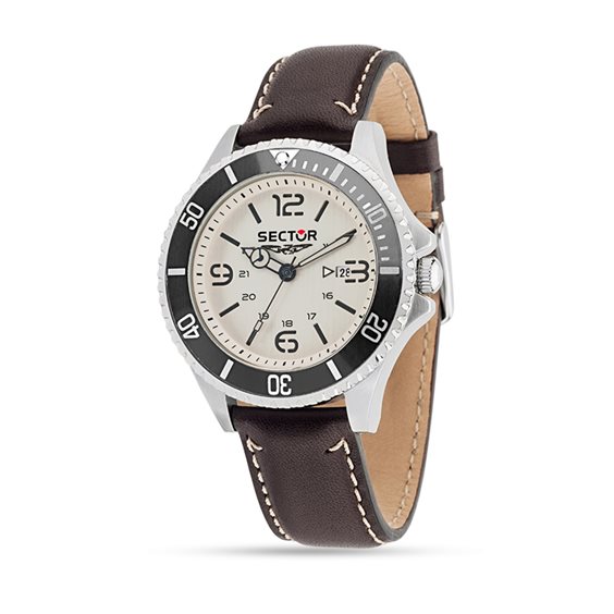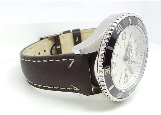 Orologio solo tempo al quarzo, water resistant 100mt, cassa e fondello in acciaio anallergico 316L, quadrante silver e fondello a vite, cinturino in pelle marrone con cuciture in contrasto.