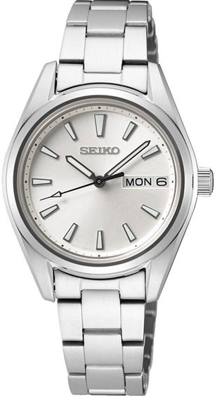 Movimento al quarzo 3 sfere giorno/data - Cassa a bracciale in acciaio inossidabile - Fondello a vite - Vetro zaffiro - Indici e sfere con lumibrite - Chiusura déployante con pulsante di rilascio - Impermeabilità 10 bar - Diametro cassa 29,8 mm