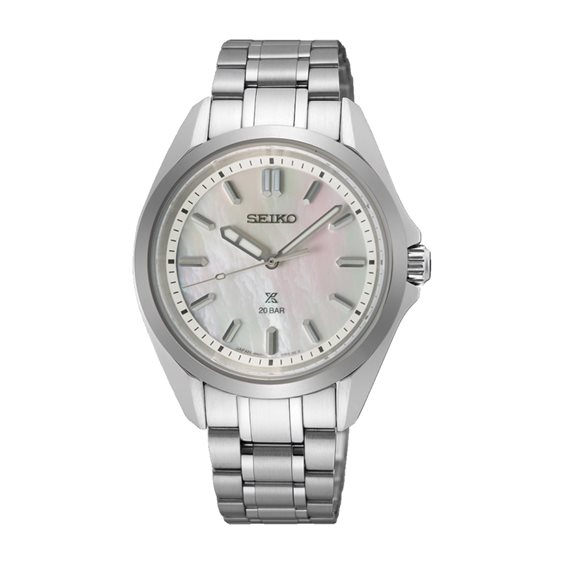 Seiko presenta la prima proposta Prospex dedicata ai polsi femminili. Il quadrante bianco è realizzato in madreperla, un materiale che emana un'eleganza innata. Allo stesso tempo, la forma delle sfere e l'uso della Lumibrite migliorano la leggibilità in ogni ambiente, come ci si aspetta da un moderno orologio sportivo. Un bracciale di alta qualità garantisce un comfort eccellente grazie ai suoi anelli più corti, che permettono di adattarsi perfettamente anche ai polsi più delicati.