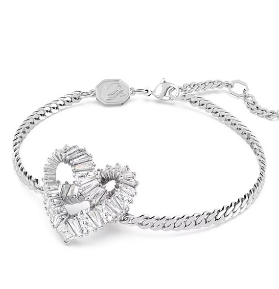 Questo bracciale placcato rodio sfoggia un design intrecciato veramente unico che converge in un’elegante forma a cuore completamente ricoperta da cristalli Cry dal taglio Baguette creando un effetto di estrema brillantezza. Indossato su una delicata catenina con un’unica pietra rotonda all’estremità, è un gioiello radioso che può essere elegantemente abbinato ad orecchini o a una collana della stessa famiglia. Sceglilo per il tuo portagioielli o fanne il regalo perfetto per una persona cara. Immagini a scopo illustrativo.