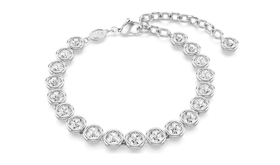 Realizzato con un mix classico di tonalità soffuse, questo bracciale Imber Tennis è la scelta ideale per un tocco di intramontabile raffinatezza. Il design placcato rodio presenta un filo completo di cristalli taglio Round con montatura a castone bombata ed è completato da una chiusura con gancio a moschettone. Un modo ideale per esaltare il tuo styling casual o per elevare un look da sera. Immagini a scopo illustrativo.