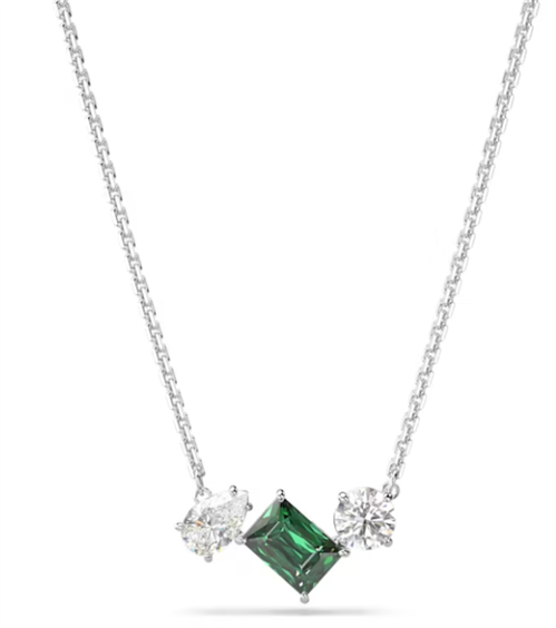 Questo elegante pendente Mesmera offre un tocco di squisita raffinatezza con il suo audace mix di tagli e colori. Montato su una delicata catena, questo design placcato rodio presenta un trio di Swarovski Zirconia con montature a griffe di diverse forme e una splendida pietra centrale in un verde ipnotico. Un meraviglioso regalo che valorizzerà ogni stile. Articolo nr.: 5668278 Collezione: Mesmera Lunghezza (minima - massima): 38 - 45 cm Dimensione decorazione: 1.2 x 2.2 cm Materiale: Placcatura rodio, Zirconia Colore: Verde Tipo di fermaglio: Moschettone