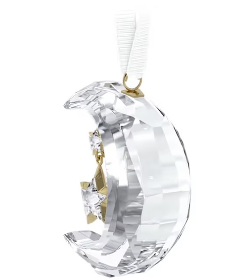 Traendo ispirazione da un cielo notturno stellato, questa maestosa decorazione conferirà un tocco celestiale a qualsiasi decorazione festiva. Lo scintillante design con 200 radiose sfaccettature, rappresenta una luna crescente con due stelle sospese, incastonate in una montatura in tonalità oro champagne. L’insieme è sospeso su un lussuoso nastro gros-grain bianco. Appendila a casa tua ed esprimi un desiderio per l’anno che verrà. Oggetto decorativo. Non è un giocattolo. Non adatto ai bambini di età inferiore a 15 anni.