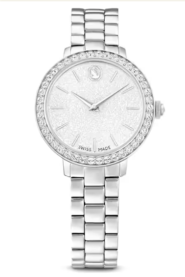 Ispirato ai gioielli Matrix di Swarovski, questo orologio da 30 mm cattura il medesimo senso di stile contemporaneo ed espressivo. Il design in acciaio inossidabile presenta una lunetta a pavé con 42 cristalli incastonati, mentre il quadrante, dalla splendida forma rotonda, è caratterizzato da un effetto glitter e include sottili indici e lancette, oltre al logo cigno a ore 12. Oltre a un ulteriore cristallo incastonato all’interno della corona, questo orologio si distingue per il suo bracciale a tre maglie, che scivola con eleganza attorno al polso. L’orologio Swiss Made è resistente all’acqua fino a 50 m ed è il compagno perfetto per ogni occasione.