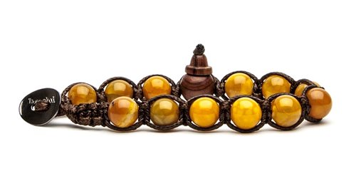 In Tibet i gioielli hanno un forte valore simbolico e tramandano valori culturali e religiosi antichissimi. Nella tradizione buddhista le gemme e i gioielli servono come metafore per gli ideali della fede ed esprimono misteriose condizioni spirituali e attributi interiori nascosti. Tamashii (o Shamballa) è un bracciale utilizzato dai monaci tibetani per favorire la meditazione, per le pratiche religiose e come talismano. Infatti Tamashii significa “anima” e il termine deriva da 'tama' che significa “gioiello”, quindi “gioiello dell’anima”. Chi lo indossa persegue un ideale di pace e di amore verso se stesso e verso il mondo, il bracciale aiuta a proteggere la sua anima, a farla crescere e farle trovare un ruolo ed un senso all'interno della vita. Prodotto realizzato in Tibet e benedetto da monaci buddisti. Ogni bracciale è spedito con relativa confezione originale e certificato di garanzia. Bracciale Tamashii Tradizionale a 1 giro Bracciale tradizionale originale tibetano (Shamballa) realizzato in Tibet con pietre naturali dure, semi-preziose e preziose e benedetto da monaci Buddisti. Ogni bracciale Tamashii è caratterizzato dalla presenza della Calabash (zucca) e dal bottone inciso Tamashii. Il giallo è uno dei cinque colori fondamentali nel buddismo ed è rappresentato dal Buddha Ratnasambhava che favorisce il processo di trasformazione in cui l’orgoglio si tramuta in saggezza di identità. Il giallo è il colore dei monaci e significa distacco dalle sovrastrutture sociali e ascesa spirituale. Questo Tamashii favorisce la consapevolezza del proprio essere e aiuta a trovare il significato della propria vita. Bracciale originale tibetano Tamashii realizzato con pietre naturali AGATA GIALLO SCURO. Unisex e taglia unica (il bracciale è predisposto per adattarsi a qualsiasi diametro di polso). Ogni bracciale è spedito con relativa confezione originale e certificato di garanzia.