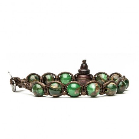 Bracciale Tamashii Quarzo Mosaico Verde. Cordoncino marrone in cotone cerato. Taglia unica ma predisposto per adattarsi ad ogni polso. Le pietre sono naturali perciò la foto è indicativa come tonalità, ma ogni bracciale è diverso. Il Quarzo mosaico verde è un armonizzatore naturale, il mix di mosaic quartz e sabbia di pirite dona equilibrio, allevia gli stati di insicurezza contrastando le energie disturbanti e promuovendo l'autoaffermazione, permettendo l'afflusso di benevolenza, generosità e gioia. Nella sua variante verde simboleggia equilibrio e armonia, ma anche vigore giovanile e azione. MADE IN TIBET