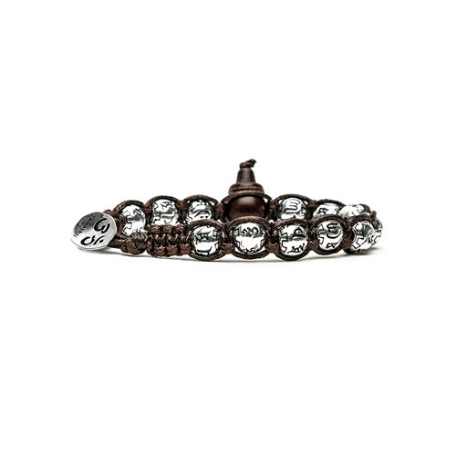 Bracciale originale in edizione limitata Tamashii 'Ruota della preghiera' arricchito da ruote a sfera in argento 925‰ incise con il mantra “Om Mani Padme Hūm” del Buddha della compassione Cenresig. Base di corda colore MARRONE e chiusura in argento 925‰ personalizzata con logo Tamashii. Unisex e taglia unica (il bracciale è predisposto per adattarsi a qualsiasi diametro di polso).