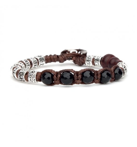 Braccialetto realizzato con cordino marrone, passanti in argento 925% con inciso il mantra "Om Mani Padme Hūm" e sfere d'onice nera sfaccettata dal diametro di 6 mm. Misura estremamente regolabile. I bracciali Tamashii sono bracciali originali tibetani chiamati anche Shamballa realizzati in pietre naturali. Ogni bracciale donna e bracciale uomo ha come elemento "La Calabash" una zucca piena di semi fatta in legno come simbolo della continuità della vita e della felicità.