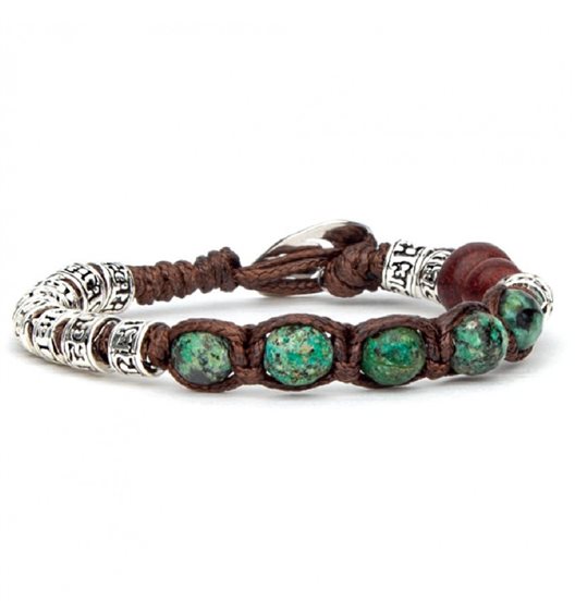 Bracciale Tamashii BHS924-S4-75 Braccialetto realizzato con cordino marrone, passanti in argento 925% con inciso il mantra "Om Mani Padme Hūm" e sfere in turchese africano sfaccettato dal diametro di 6 mm. Misura estremamente regolabile. I bracciali Tamashii sono bracciali originali tibetani chiamati anche Shamballa realizzati in pietre naturali. Ogni bracciale donna e bracciale uomo ha come elemento "La Calabash" una zucca piena di semi fatta in legno come simbolo della continuità della vita e della felicità