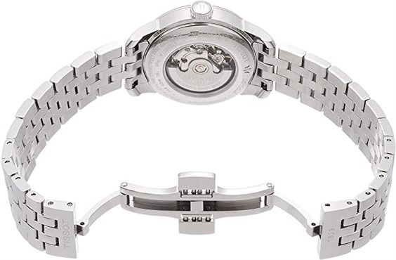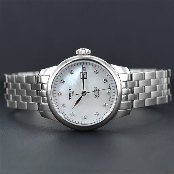 Orologio da donna della collezione lady auto di Tissot, con movimento automatico. Cassa e cinturino in acciaio con finitura lucida. Fondello trasparente che lascia intravedere il meccanismo. Quadrante in madreperla con indici di diamanti e datario a ore 3 Lancette in metallo silver. Riserva di carica di 38 ore