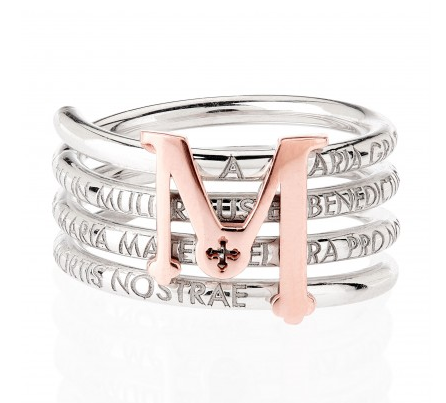 Una spirale di parole che scorrono lungo la sua lunghezza. Un fiume di lettere che iniziano con Maria Gratia Plena. Al centro troneggia l’iconica M, l’omaggio di TUUM alle forze generatrici del mondo: M di Mater, M di Maria, M di Mondo. Un’armonia di linee morbide e sinuose che incontrano la solidità e la forza del capolettera creando un anello elegante, molto raffinato, in metalli nobili come l’argento e l’oro. Collezione TUAM X - Anello in Argento Rodiato e Oro Rosa 9kt con l’iconica M di TUUM.
