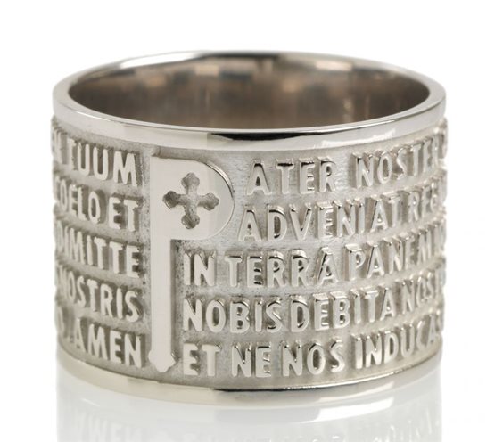 ANELLO ANIMAE IN ARGENTO RODIATO MODELLO PATER In rilievo le parole del Padre Nostro nella lingua Latina Gli anelli in argento rodiato della collezione «Animae» riproducono in rilievo la preghiera del Padre Nostro e dell’Ave Maria nella lingua Latina. L'argento rodiato lucidato esalta le tonalità del rodio a contrasto creando un effetto di straordinaria luminosità che avvolge l’anello e le parole impresse.
