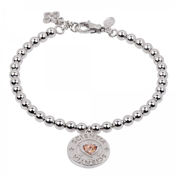 bracciale Settedoni con Topazio, Scientia - lunghezza cm 17.5 con accorcio fino a cm 15.5 - SCIENTIA: nel linguaggio comune “scienza” significa conoscenza umana di tipo tecnico, mediante la quale si arriva alla conoscenza del mondo e dei suoi meccanismi, nel linguaggio arcaico “scienza” significa anche “amore”. Il dono della scienza diventa il dono che permette all’amore di entrare nella conoscenza. Chi ama capisce meglio, capisce prima, capisce di più; il cuore che ama comprende più della mente. - - Bracciale in Argento con grani e Dono in Argento 925 Rodiato con Topazio pesca