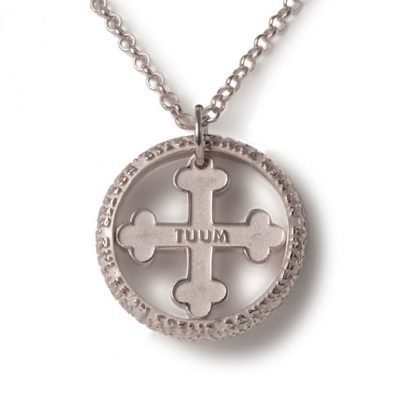 Collana TUUM FLORE in argento 925 FLORE prende il nome dal “fiore” raffigurato all’interno della Fede su cui sono impresse le parole in rilievo. Custodito in un cerchio, FLORE simboleggia l'essenza stessa della vita. Nella versione Lux, risplende colorato da pietre preziose.