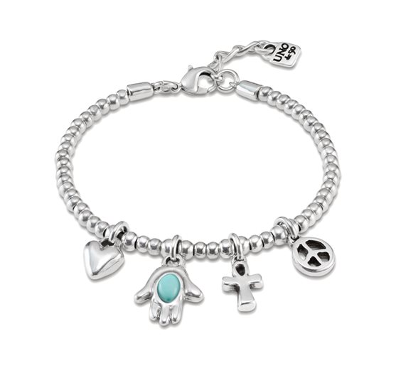 Bracciale composto da piccole perline a forma di sfera e da molteplici charm dalle diverse simbologie: mano, cuore, simbolo della pace e croce con dettaglio in vetro di Murano turchese. Chiusura a moschettone regolabile. Realizzato a mano in Spagna. La collezione Protected rappresenta oggetti ancestrali, che diventano degli amuleti per attirare la fortuna o per proteggere contro gli eventi negativi. Gioielli da portare sempre con te, ovunque tu vada.