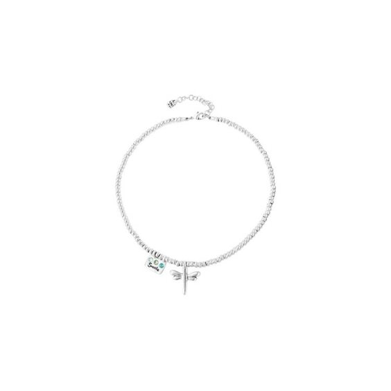 Collana corta composta da vari elementi in metallo bagnato nell'argento e due charm nella parte centrale, uno a forma di piccola libellula e l'altro con il messaggio Suerte con cristalli Swarovski nelle tonalità del verde. L'accessorio perfetto per i tuoi outfit quotidiani. Un gioiello disegnato da UNOde50 in Spagna secondo un processo interamente artigianale.