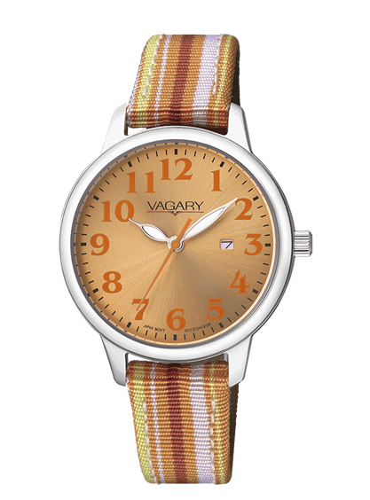 Orologio Vagary Girls, diametro 32mm, quadrante arancione con numerazione araba e data alle ore 3, impermeabile 5 atm, cinturino in pelle e tessuto