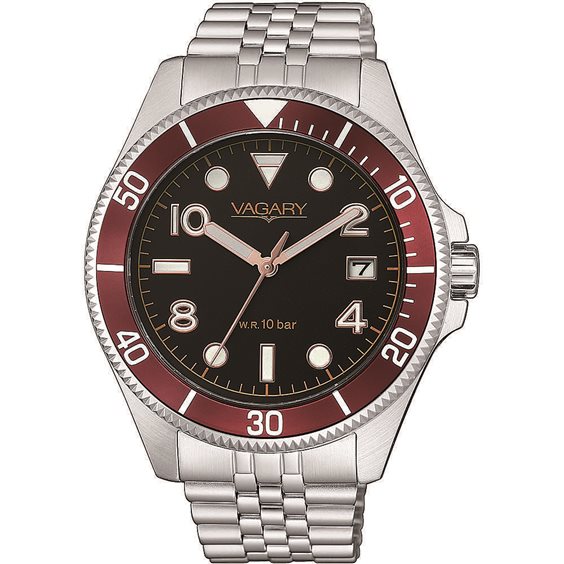 Orologio solo tempo da uomo Vagary della collezione Aqua 39. Cassa in acciaio di diametro 41mm, quadrante nero con indici e sfere chiari e ghiera in alluminio rosso. Bracciale in acciaio integrato con chiusura a pulsante. Orologio con resistenza all'acqua di 10 atm. Movimento al quarzo citizen con datario e con vetro minerale.