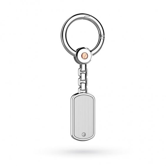 Portachiavi in argento e oro rosa. Il pendente è satinato ed è impreziosito da uno zaffiro bianco. misura cm 7
